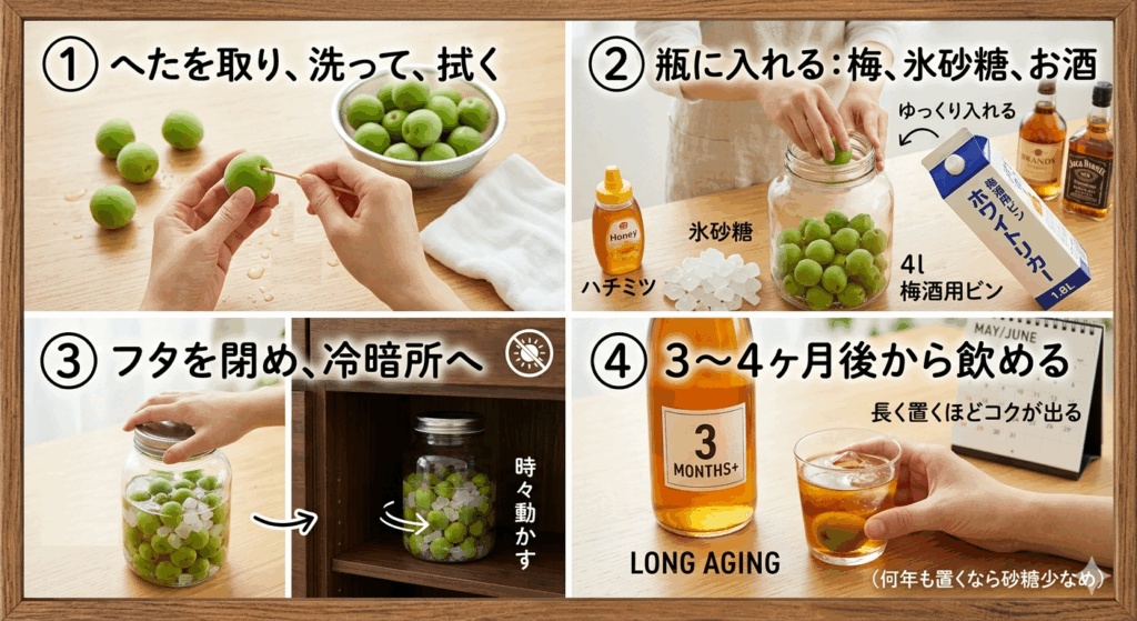 ④ 3~4ヶ月ぐらいから飲めますが、長く置くほどコクがでます。(何年も置く場合は砂糖を少なめにするとよいでしょう)